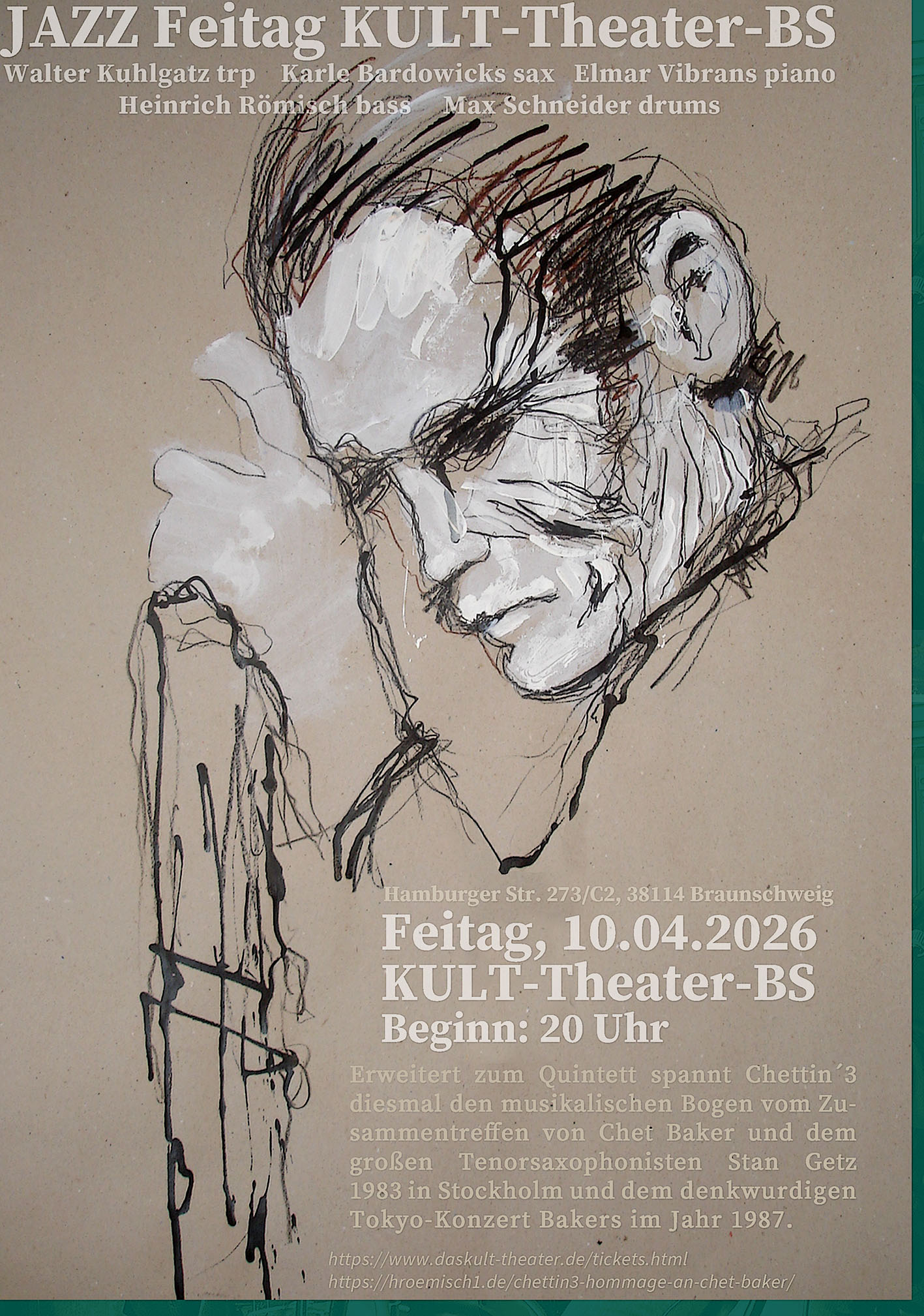 Walter Kuhlgatz, Elmar Vibrans und Heinrich Römisch beschäftigen sich schon seit vielen Jahren als Trio mit der Musik des unvergessenen Chet Bakers. Diesmal durch die Erweiterung zum Quintett mit dem großartigen Tenorsaxophonisten Karle Bardowicks und Maximilian Schneider am Schlagzeug wird der musikalische Bogen weiter gespannt.