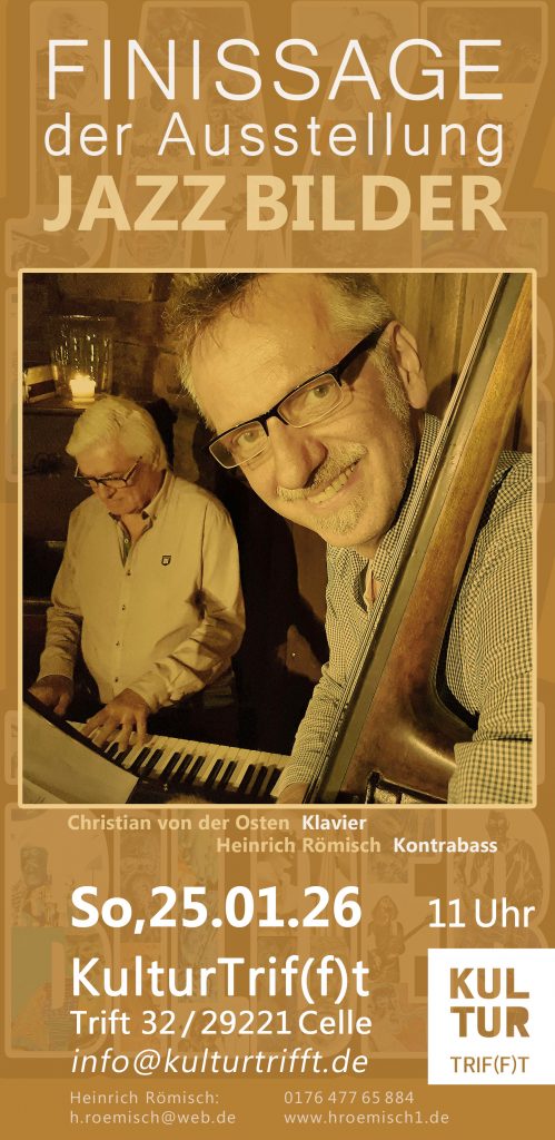 Am Sonntag, den 25.01.2026 um 11 Uhr anlässlich der Finissage meiner Ausstellung JAZZ BILDER, wird Christian von der Osten ein Gastspiel geben mit mir am Kontrabass. Herzliche Einladung!